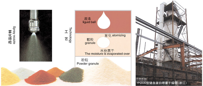 本機組是一種可以同時完成干燥和造粒的裝置。按工藝要求可以調節料液泵的壓力、流量、噴孔的大小,得到所需的按一定大小比例的球形顆粒。