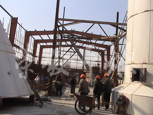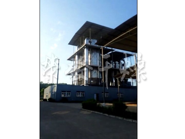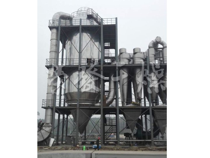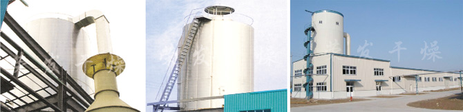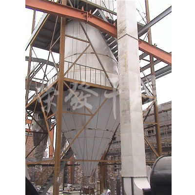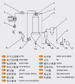 本機組工作過程為料液通過隔膜泵高壓輸入,噴出霧狀液滴,然后同熱空氣并流下降,大部分粉粒由塔底排料口收集,廢氣及其微小粉末經旋風分離器分離,廢氣由抽風機排出,粉末由設在旋風分離器下端的授粉筒收集,風機出口還可裝備二級除塵裝置,回收率在96-98%以上。