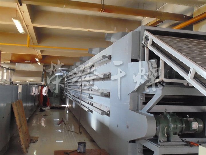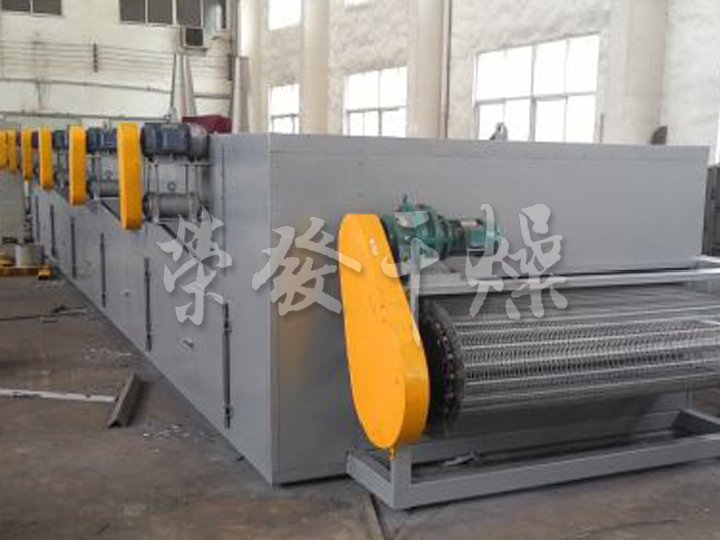 物料由加料器均勻地鋪在網帶上,網帶一般采用12-60目不銹鋼絲網,由傳動裝置拖動在干燥機內移動。干燥機由若干單元組成,每一單元熱風獨立循環,部分尾氣由專門排濕風機排出,廢氣由調節閥控制,熱氣由下往上或由上往下穿過鋪滿物料的網帶完成熱量與質量傳遞的進程,帶走物料水份。網帶緩慢移動,運行速度可根據物料溫度自由調節,干燥后的成品連續落入收料器中。上下循環單元根據用戶需要可靈活配備,單元數量亦可根據需要選取。