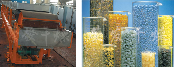 該機由液體變固體粒狀,主要是通過造粒模頭造粒,采用回轉式鋼帶連續進行,通過噴淋水冷卻定型。