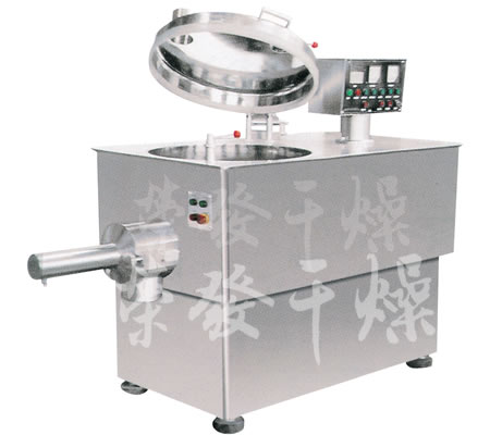 粉體物料與粘合劑在圓筒形容器中由底部混合漿充分混合成濕潤軟材,然后由側置的高速粉碎槳切割成均勻的濕顆粒。